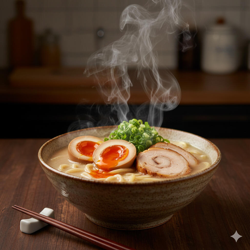 Création de Toppings : Maîtrisez la cuisson et la marinade des célèbres Œufs Ajitsuke Tamago (cœur coulant) et préparez la garniture Tori Chashu (roulé de poulet braisé mariné).