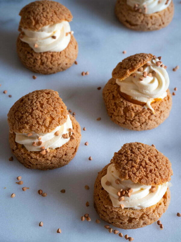 Pâte à choux, craquelin croustillant et crème onctueuse au praliné.